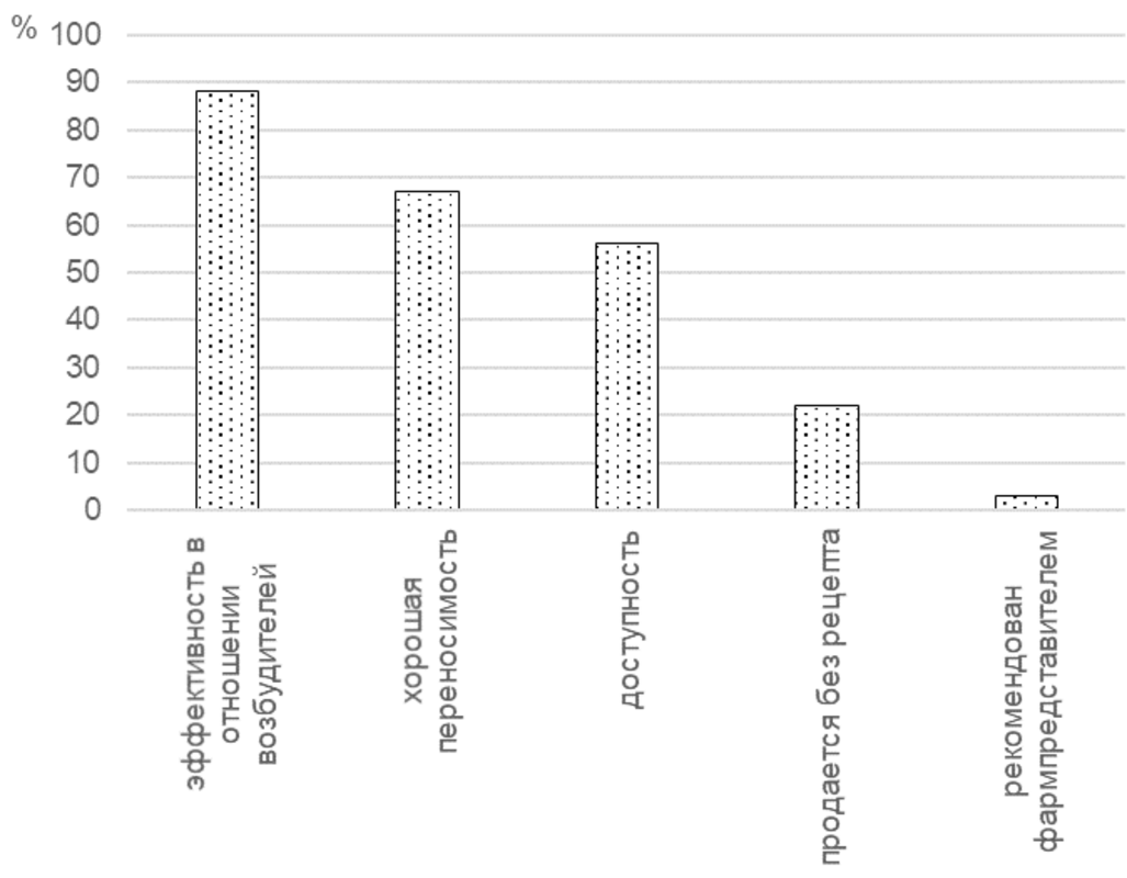 Результаты. Наиболее часто используемыми антибактериальными средствами являются b-лактамные антибио- тики (пенициллины, цефалоспорины) и фторхинолоны. Реже используются линкозамиды (линкомицин), тетра- циклины (доксициклин), азитромицин. Для выбора того или иного антибактериального лекарственного средства наиболее важное значение имеет его и доступность (цена), а также хорошая переносимость пациентами. Не- маловажное значение имеет возможность приобрести антибиотик без рецепта. Наиболее часто врачи назначают лекарственное средство на срок не менее 5 дней, реже – не менее 7 дней. Только часть опрошенных врачей руко- водствуется динамикой клинической картины и рекомендациями производителя. Из числа основных возбудите- лей инфекционно-воспалительных заболеваний челюстно-лицевой области и шеи врачи наиболее часто отметили золотистый стафилококк. Для профилактики послеоперационных осложнений врачи-стоматологи наиболее часто назначают амоксициллин и цефалоспорины.