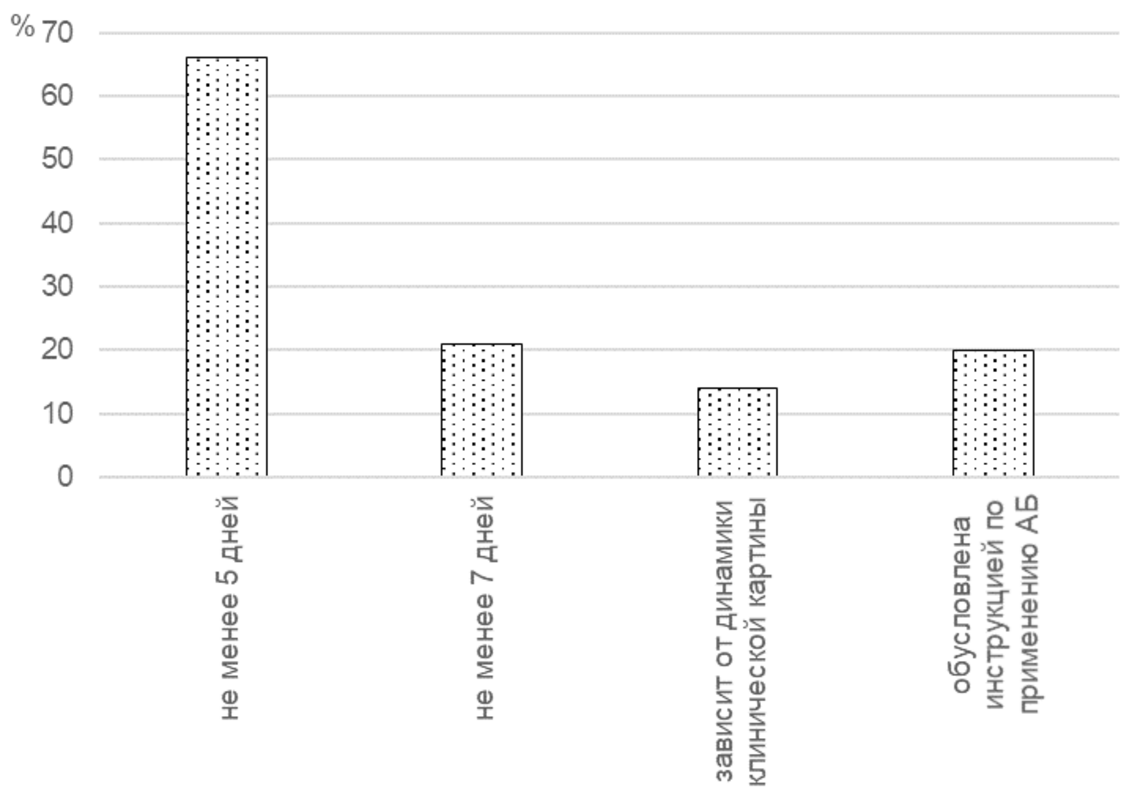 Относительно длительности антибакте- риальной терапии, проводимой пациентам с ин- фекционно-воспалительными заболеваниями челюстно-лицевой области и шеи, ответы врачей распределились следующим образом. Наиболь- шее число респондентов (87 врачей, 66%) отме- тило ответ «не менее 5 дней», «не менее 7 дней» указали 26 (21%) врачей. При выборе длительно- сти курса АБТ динамикой клинической картины руководствуются 17 (14%) врачей, инструкцией по применению лекарственного средства – 25 (20%) врачей (рис. 2).