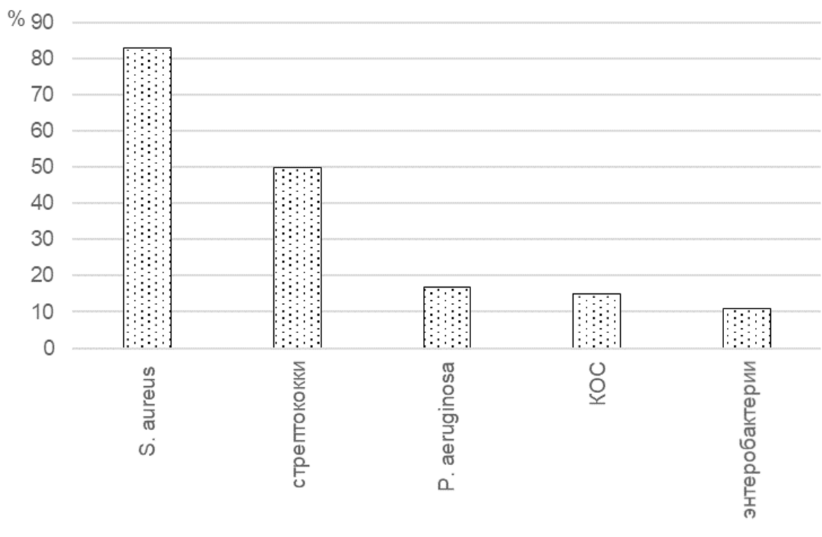 но-воспалительных заболеваний челюстно-лице- вой области анкетируемые врачи наиболее часто отметили S. aureus (102 врача, 83%), 62 (50%) врача отметили стрептококков, 18 (15%) врачей – коагулазотрицательных стафилококков (КОС), 13 (11%) врачей – энтеробактерии. При этом 21 (17%) опрошенный указал в числе основных воз- будителей инфекционно-воспалительных забо- леваний челюстно-лицевой области P. aeruginosa (рис. 3).