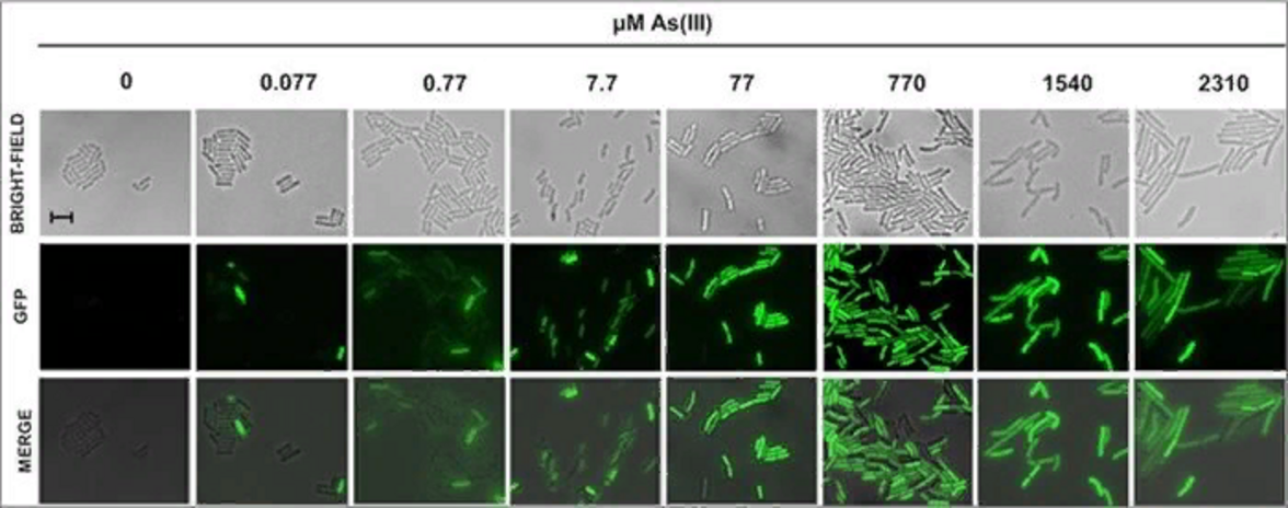 Пример биосенсора, предназначенного для обнаружения мышьяка в воде. Клетки Bacillus subtilus экспрессируют GFP в ответ на увеличение концентрации мышьяка. Источник: Valenzuela-Garica L.I., et al./Microbiology Spectrum, 2023
