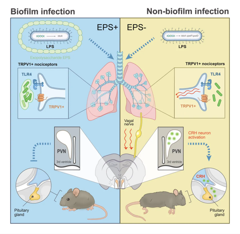 Биопленка маскирует бактерии от обнаружения сенсорными нейронами легких, что приводит к ограничению заболевания (слева). В отсутствие биопленки сенсорные нервы легких обнаруживают бактерии через TLR4 и ЛПС и передают сигналы через блуждающий нерв в гипоталамус. Нейроны гипоталамуса активируются и высвобождают CRH, который опосредует фенотип заболевания (справа). Иллюстрация: Jesse Horne