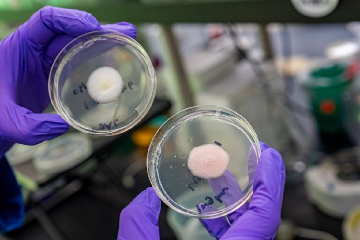 Чашка Петри слева содержит натуральную плесень коджи, в то время как в чашке справа было сконструировано более высокое содержание питательного вещества под названием эрготионеин и больше гема - молекулы железа, которая содержится во многих организмах, но особенно много ее в тканях животных, что придает мясу характерный вкус. Фото: Marilyn Sargent/Berkeley Lab.