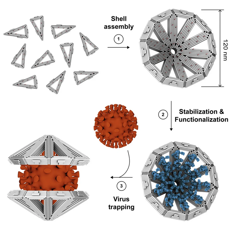 Используя ДНК-оригами, авторы сконструировали двухмерные строительные блоки в форме треугольников, которые соединяются друг с другом, край в край, как кусочки головоломки. Затем, используя криоэлектронную микроскопию (криоЭМ), исследователи убедились, что треугольники собираются в конусообразные многогранные оболочки. Затем они покрыли внутреннюю часть каждой оболочки антителами. Эти оболочки могут соединяться вокруг вирусов, обволакивая вирусную частицу диаметром более 100 нм, что теоретически может отгородить вирус от клетки потенциального хозяина и предотвратить инфицирование, хотя исследователи не проводили клинических испытаний. Важно отметить, что оболочки также могут быть покрыты другими веществами, связывающими вирусы. В данном случае исследователи использовали сульфат гепарина - вещество, которое прилипает к оболочкам многих вирусных белков.