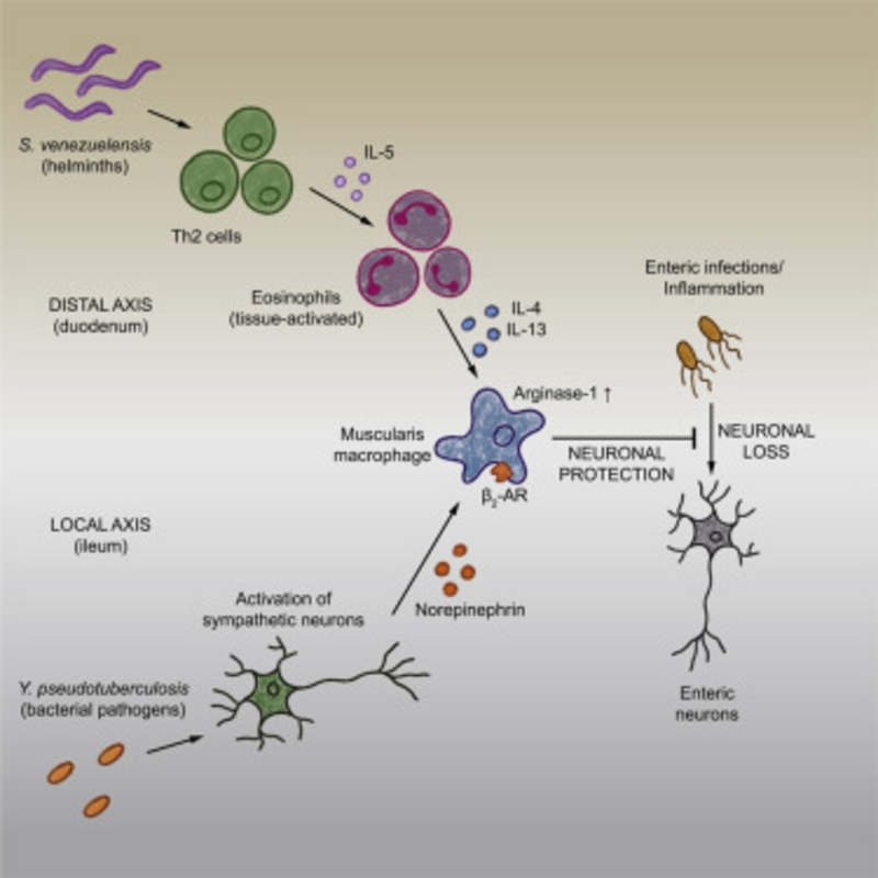 Нейропротекция, вызванная бактериями, основывалась на активации симпатических нейронов кишечника и сигнализации через β2-адренергические рецепторы (β2AR) на ММ. В отличие от этого, нейропротекция, опосредованная гельминтами, зависела от Т-клеток и системной продукции интерлейкина (IL)-4 и IL-13 эозинофилами, которые индуцировали ММ, экспрессирующие аргиназу, что предотвращало потерю нейронов от неродственной инфекции, локализованной в другом отделе кишечника.