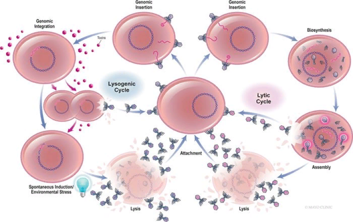 Литические фаги реплицируются внутри бактерий и лизируют клетку-хозяина сразу после сборки. В лизогенном цикле фаги интегрируют свой геном в геном клетки-хозяина.
