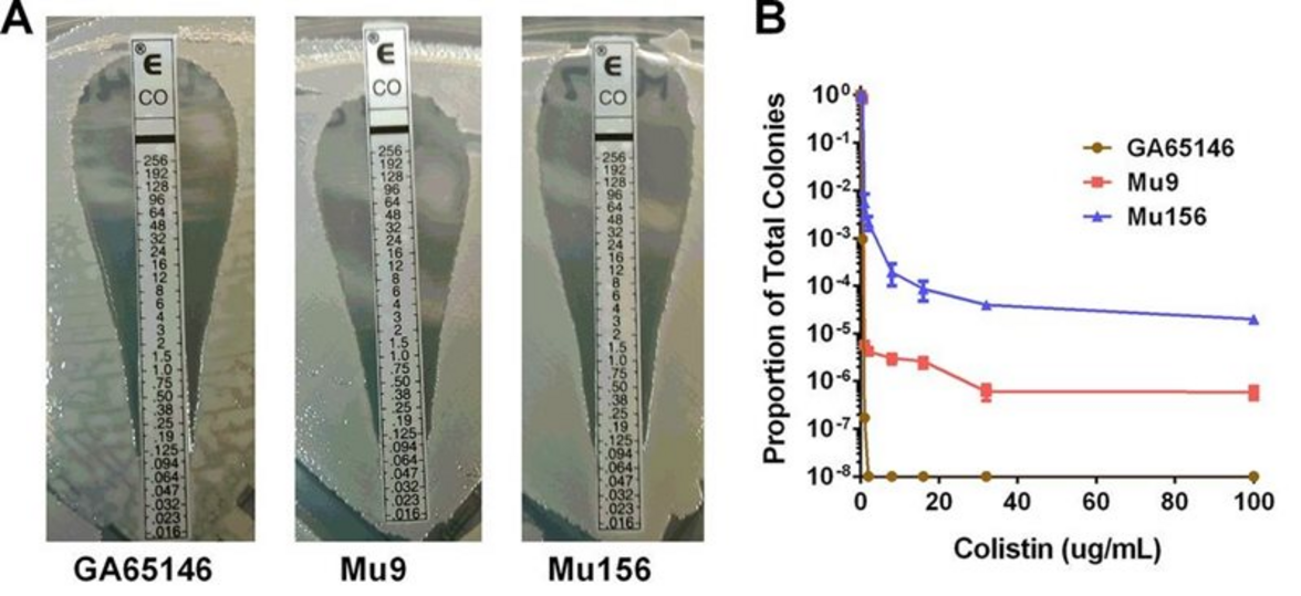 E-тесты и PAP для колистин-гетерорезистентных штаммов K. pneumoniae (Mu9, Mu156) по сравнению с чувствительным штаммом (GA65146). С помощью E-тестов не удалось выявить резистентные субпопуляции, а с помощью PAP - удалось. Источник: Band V.I., et al./mBio, 2018