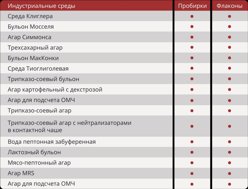Рады сообщить, что в нашем Каталоге появились готовые питательные среды Российского производства для санитарной и промышленной микробиологии: