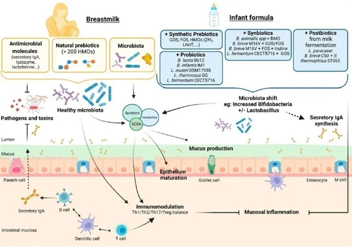 В отличие от этого, детские молочные смеси вызывают относительно более быстрое созревание и раннюю диверсификацию микробиоты кишечника, что приводит к обогащению анаэробными бактериями и уменьшению количества полезных бактерий. В настоящее время молочные компании сосредоточены на приготовлении детских молочных смесей, близких по составу к материнскому молоку, чтобы обеспечить правильное развитие микробиоты кишечника и формирование стойкого иммунитета у младенцев.