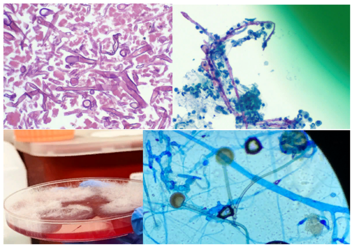 Изображение 1. Окрашивание биоптата легкого (вверху, слева) и окрашивание по Папаниколау бронхоальвеолярного лаважа (вверху, справа) выявило широкие, лентовидные, прямоугольные ветвящиеся гифы (видимые в биоптате легкого) со споруляцией. Быстрый рост наблюдался из респираторных культур биоптата ткани на 2-й день (внизу, слева), где были видны широкие гифы со спорангиями (внизу, справа).