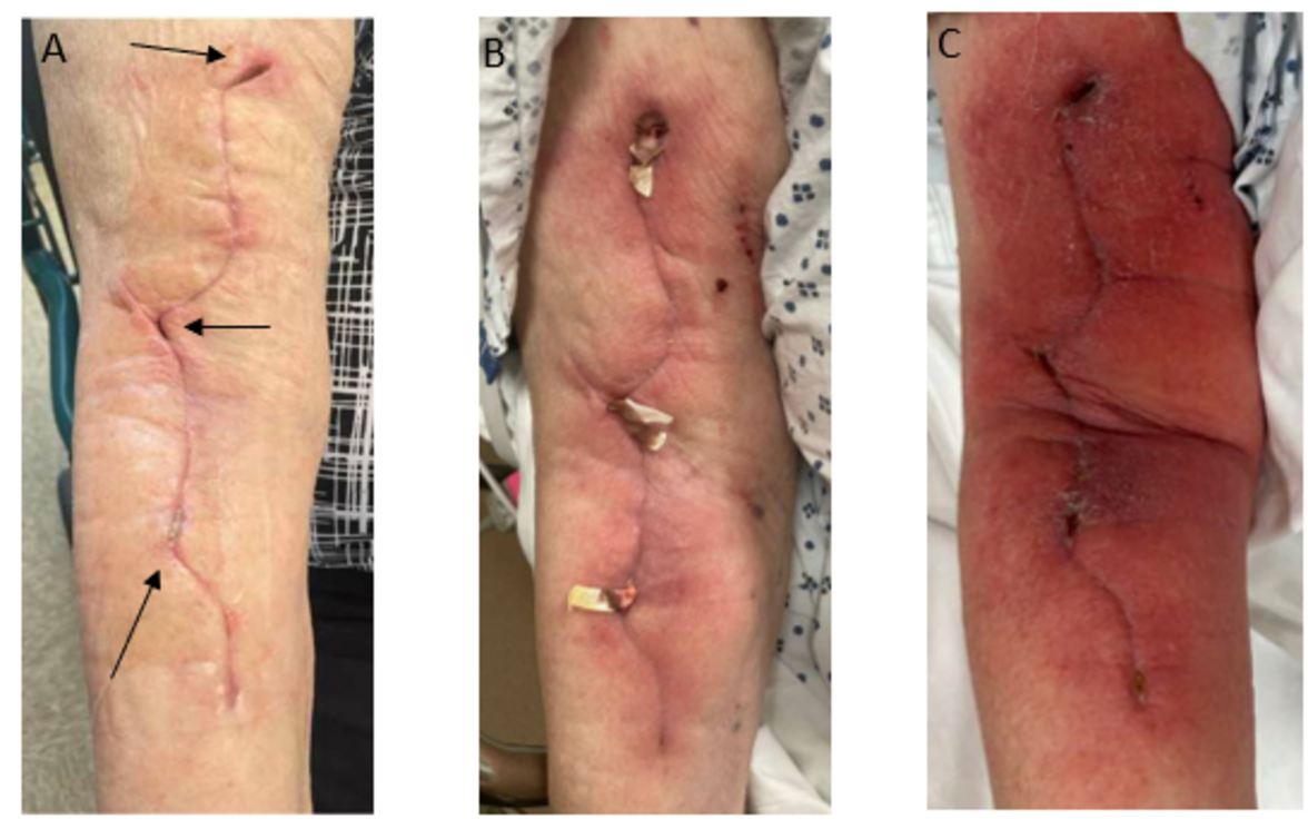 Иллюстрация 1. Фотографии раны правой верхней конечности. Снимок A был получен за две недели до поступления на амбулаторный прием к хирургу, на нем видны три небольших участка расхождения раны (черные стрелки), но нет явных признаков инфекции. Изображение B было получено при поступлении и показывает три участка расхождения раны, заполненные старой йодоформной марлей, с эритемой вокруг хирургического разреза. На снимке C, сделанном через ~24 часа после снимка B, видно ухудшение и прогрессирование кожной эритемы вокруг раны.