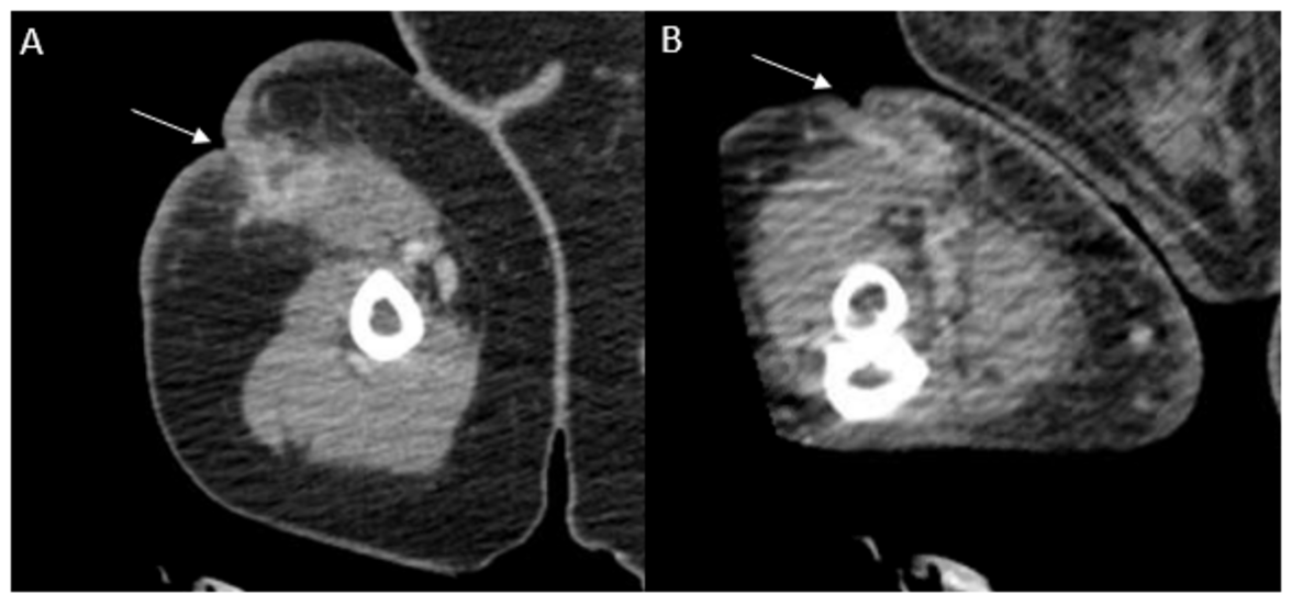 Иллюстрация 2. Компьютерная топография с контрастированием. На снимках плечевой кости (изображение A) и предплечья (изображение B) выявлено вероятное образование абсцесса (белые стрелки) длиной около 6,8 см и размером около 1,5 см в наибольшем измерении как на плечевой кости, так и на предплечье.