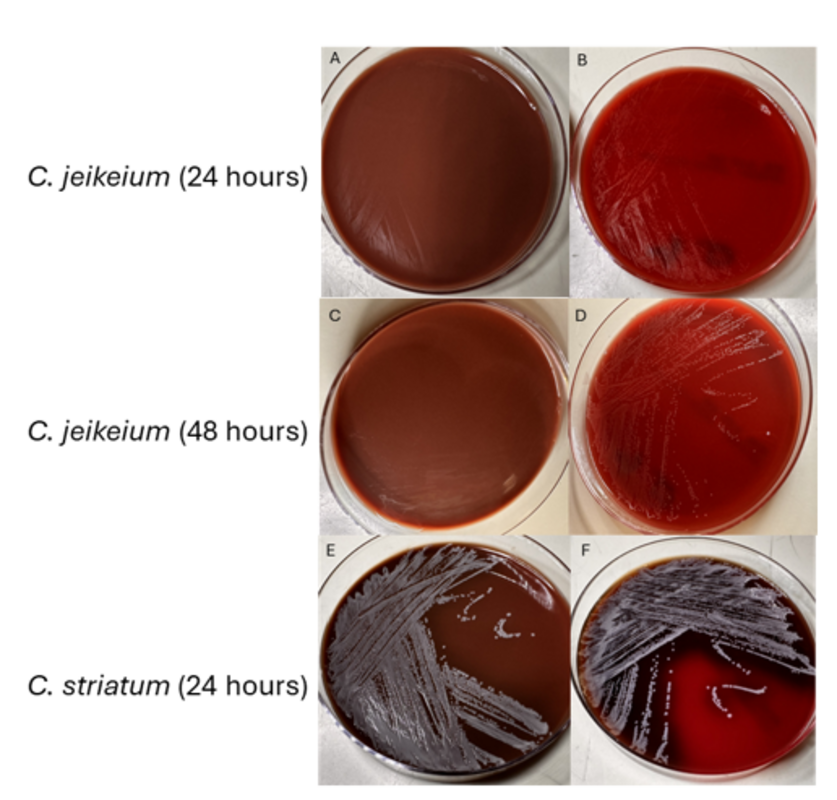 Как липофильный вид, C. jeikeium может быть трудно идентифицировать и культивировать. Он плохо растет на шоколадном агаре (илл. 3A и 3C). На кровяном агаре он имеет тенденцию к скудному или тусклому росту в течение 24 часов (илл. 3B) и появляется в виде полупрозрачных, точечных колоний в течение 48 часов (илл. 3D). Идентификация с помощью MALDI-TOF может быть затруднена до 48 часов из-за его плохого роста на стандартных средах. Для сравнения, C. striatum, нелипофильный вид Corynebacterium spp. относительно хорошо растет как на кровяном, так и на шоколадном агаре. Известно, что некоторые виды Corynebacterium, включая C. jeikeium и C. striatum, обладают множественной лекарственной резистентностью, особенно к бета-лактамным антибиотикам.