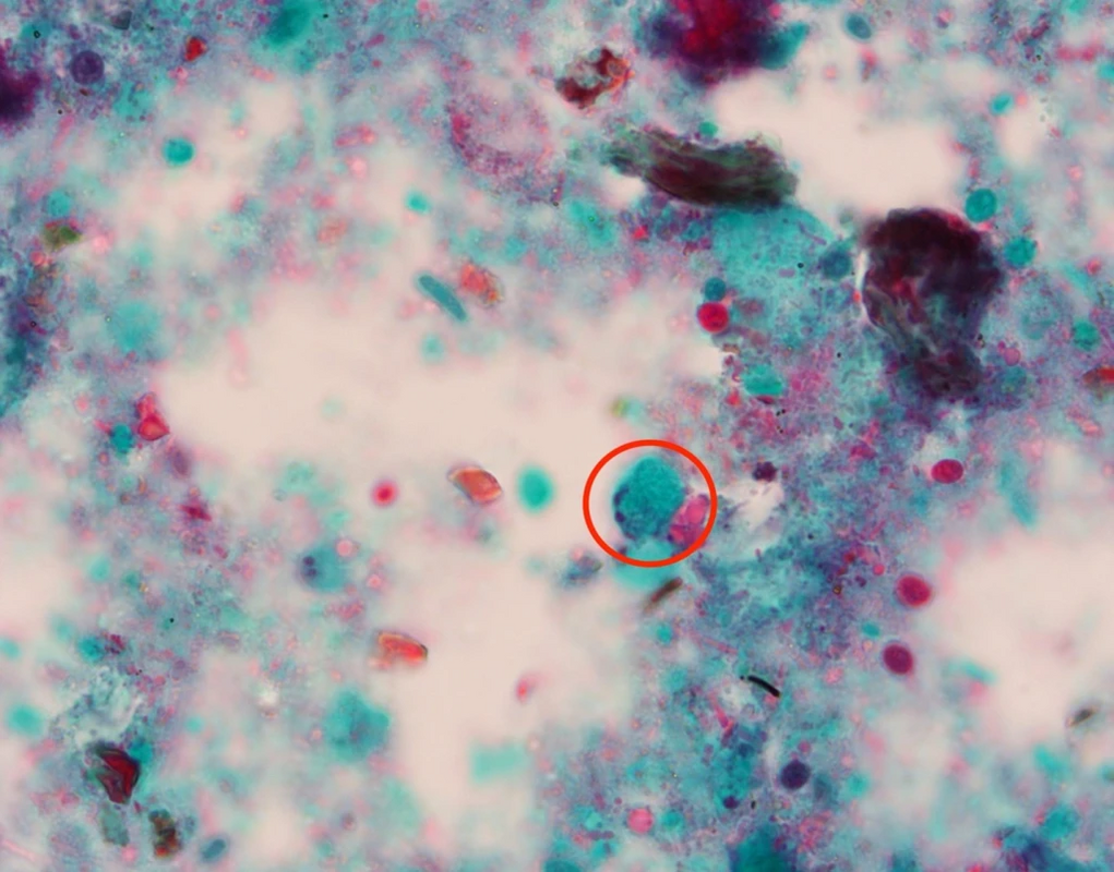 Пациентка отметила, что, по ее мнению, у нее в кале были глисты, и сдала три образца кала на исследование на яйца и паразитов. Хотя все три образца кала были отрицательными, два из трех образцов оказались положительными на наличие микроорганизма, представленного ниже. Пациентка прошла курс лечения метронидазолом в течение десяти дней, а повторное исследование на яйца и паразитов после лечения показало отрицательный результат. Через три месяца пациентка вновь обратилась к врачу с аналогичными жалобами на боли в животе, в результате чего было проведено повторное исследование на яйца и паразитов, которое вновь дало положительный результат на тот же микроорганизм.