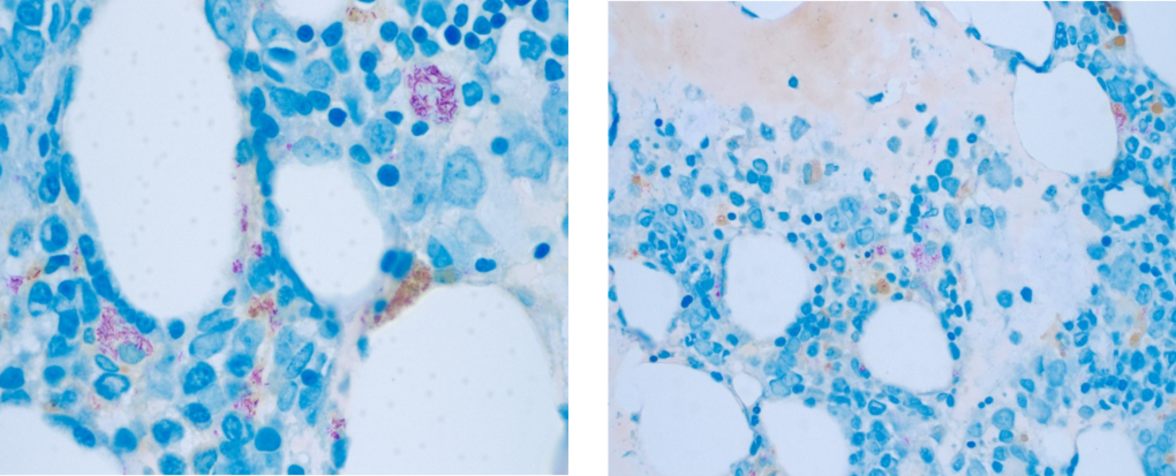 Иллюстрация: При окрашивании аспирата костного мозга выявлено множество кислотоустойчивых палочек (увеличение: слева - 100X; справа - 50X).