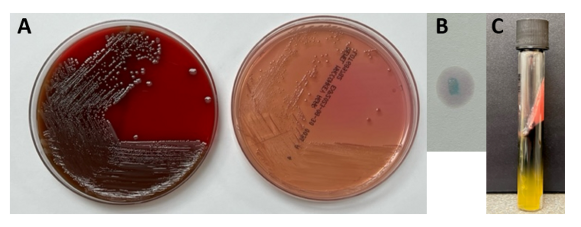 Культуры крови были взяты на анализ и молекулярную идентификацию. С помощью коммерческой мультиплексной молекулярной ПЦР панели образца положительной культуры крови не удалось провести идентификацию. Последующий рост микроорганизма на агаре Макконки через 18 часов выявил колонии не ферментирующие лактозу (изображение 1A). Микроорганизм был отрицательным по оксидазе, положительным по каталазе и индолу (изображение 1B) и демонстрировал выработку сероводорода при инокуляции на среду с тройным сахарным железом. Микроорганизм был окончательно идентифицирован как Edwardsiella tarda с помощью MALDI-TOF MS и был широко чувствителен ко всем протестированным антибиотикам, включая бета-лактамы и фторхинолоны.