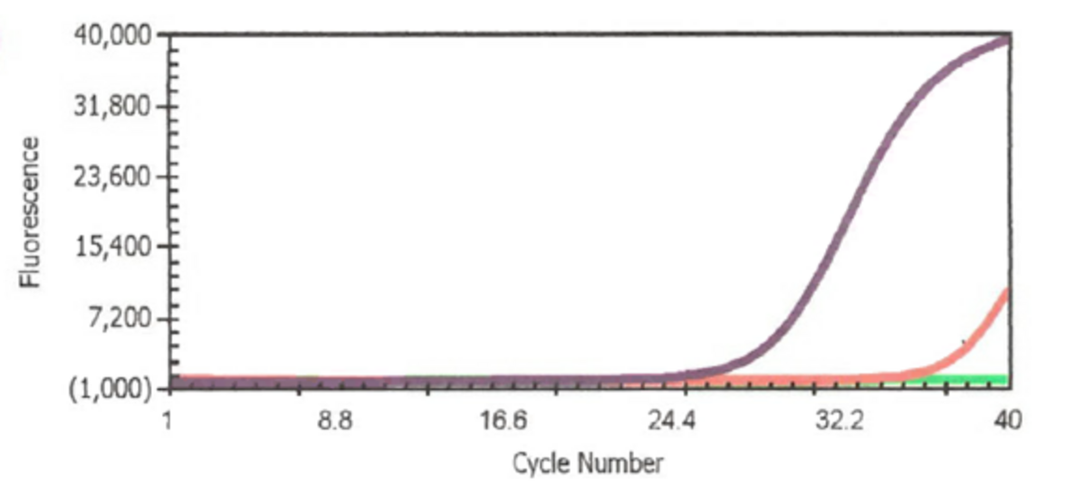 ПЦР Bordetella pertussis и Bordetella parapertussis. Зеленый = IS481, целевой ген для B. pertussis. Красный = IS1001, целевой ген для B. parapertussis. Фиолетовый = внутренний контроль (IC).