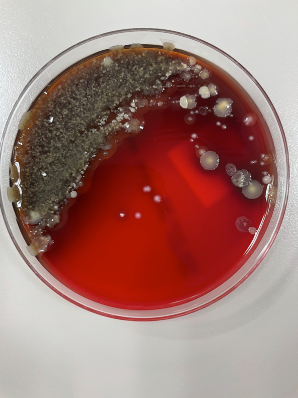 Иллюстрация 1. На этой чашке с кровяным агаром наблюдался рост нормальной флоры ротоглотки, но при этом присутствуют бактерии мукоидной морфологии. На чашке присутствует множество цветов, морфологий колоний микроорганизмов.
