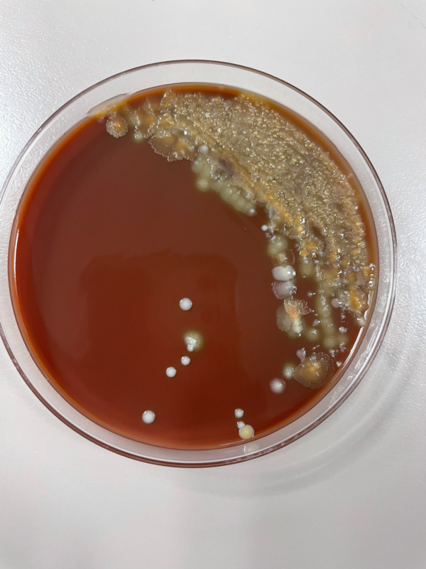 Иллюстрация 2. Чашка шоколадного агара, на которой наблюдается смешанный рост микроорганизмов. Некоторые колонии желтого цвета с плохо очерченными границами, другие - белого цвета с четко очерченными границами. Было установлено, что большинство колоний, присутствующих на этой чашке, являются нормальной флорой ротоглотки.