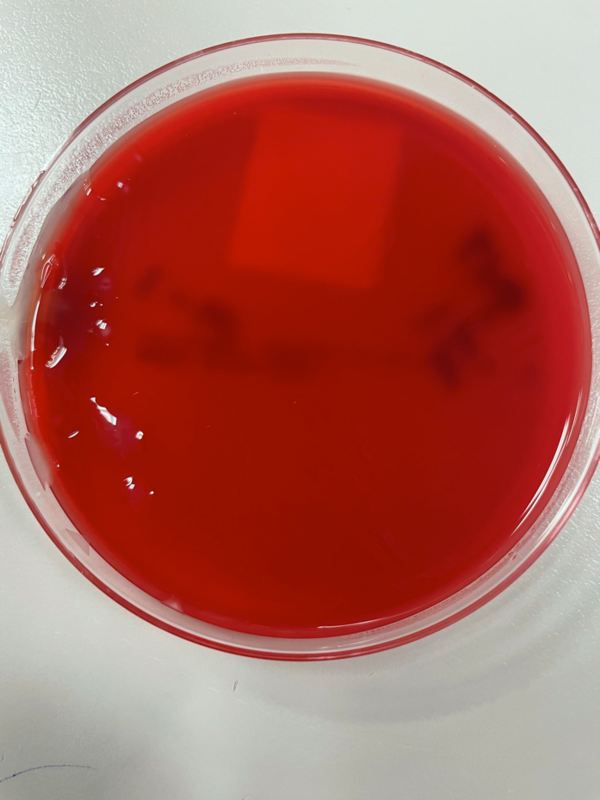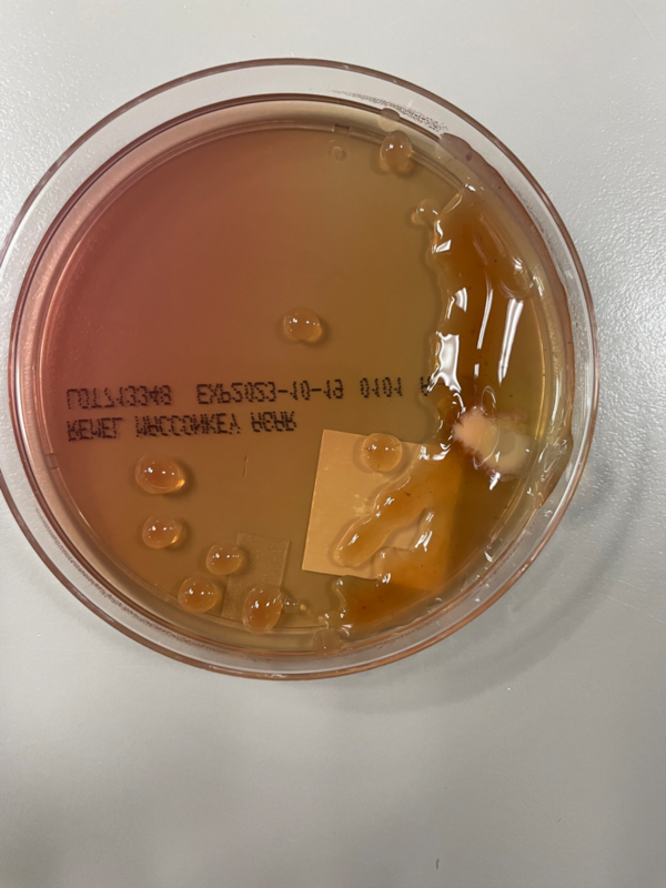 Иллюстрация 4. На среде МакКонки растут бактерии с мукоидной морфологией. Сами бактерии остаются непигментированными, коричневатого цвета, в то время как агар остается розовым. Как цвет колоний, так и цвет агара указывают на то, что данный микроорганизм не является ферментером лактозы.