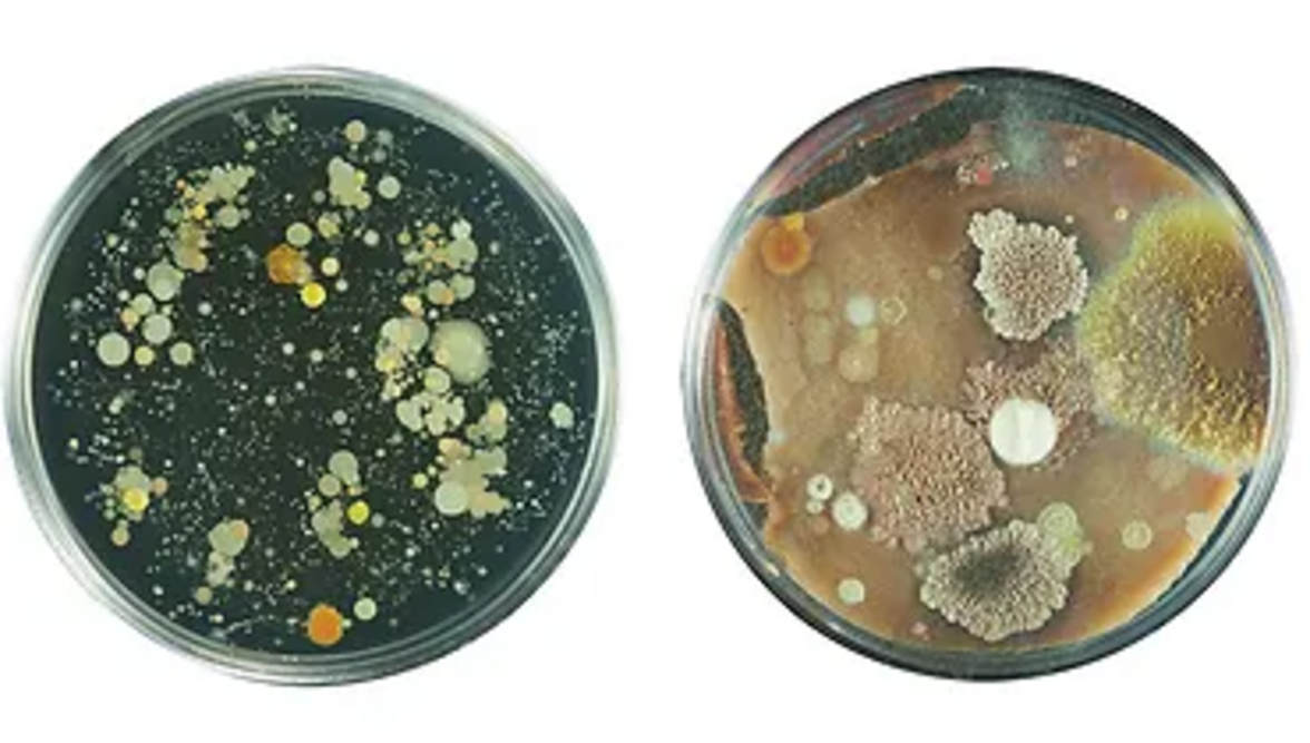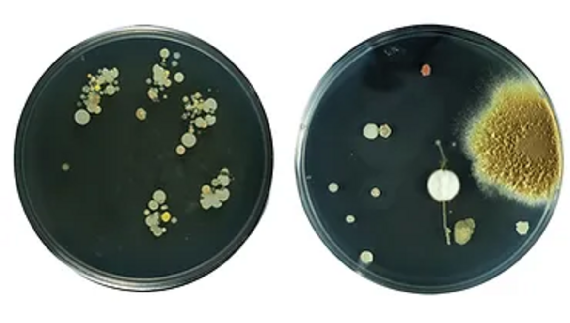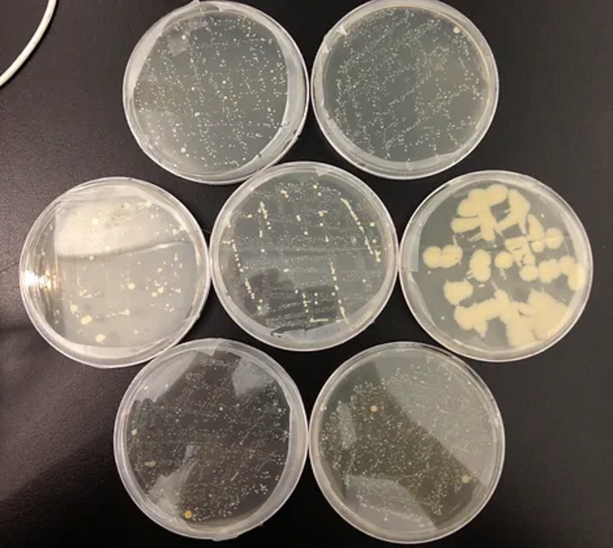 Второй вывод: несмотря на богатый рост, между чашками, полученными от человека и из окружающей среды, действительно очень мало совпадений. Известно, что условия in vitro не способствуют росту естественного разнообразия микробиома кожи, и на некоторых чашках была видна молочная биопленка без каких-либо цветов и текстур отдельных выросших колоний: