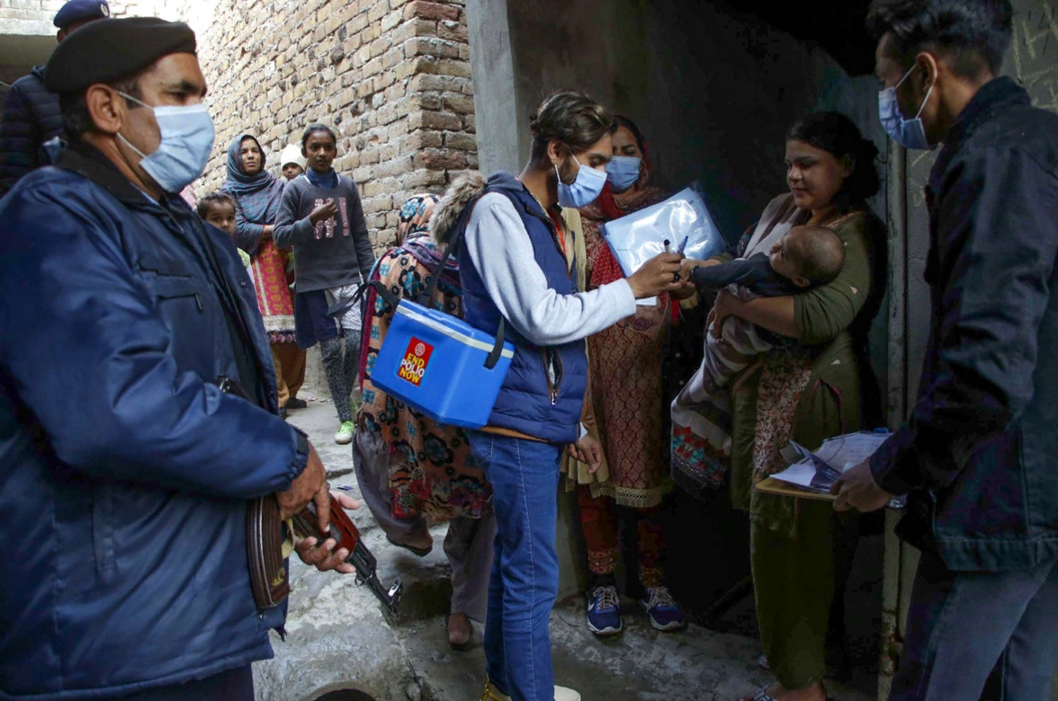 Медицинские работники вводят детям вакцину от полиомиелита в Исламабаде (январь 2021), вооруженный сотрудник полиции стоит рядом с ними для защиты. Ранее в Пакистане на вакцинаторов совершались нападения из-за слухов о том, что вакцинация наносит вред. Фото: Sohail Shahzad/EPA-EFE/Shutterstock
