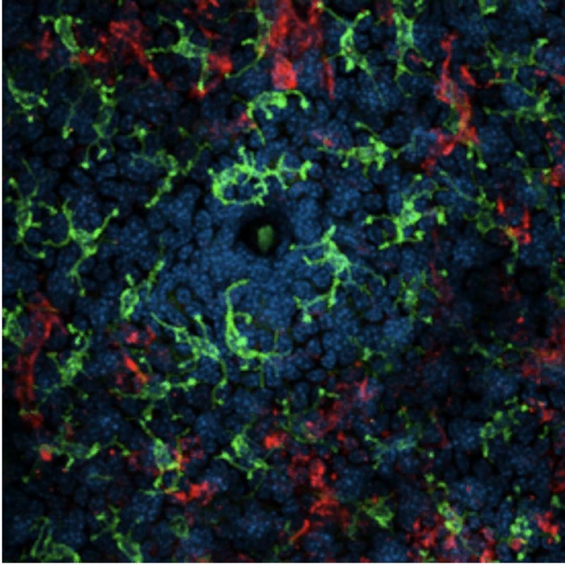 Иммунные клетки (ярко-зеленые) патрулируют вокруг волосяного фолликула (черный круг вокруг зеленого центра).