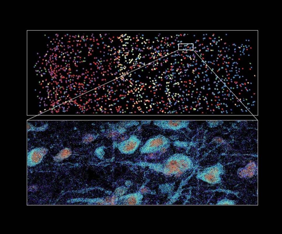 Изображение MERFISH части человеческого мозга, показывающее типы клеток, помеченные различными цветами (вверху) и помеченные молекулы РНК различных генов в отдельных клетках (внизу).Фото: Xiaowei Zhuang Lab, Harvard University and HHMI.