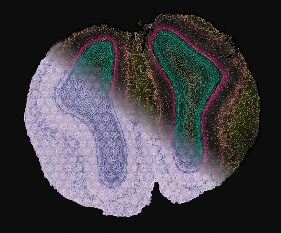 Объединенное изображение, показывающее структуру ткани, данные РНК и карты экспрессии генов с клеток в обонятельной луковице мыши со сверхразрешением. Фото: Ludvig Bergenstråhle
