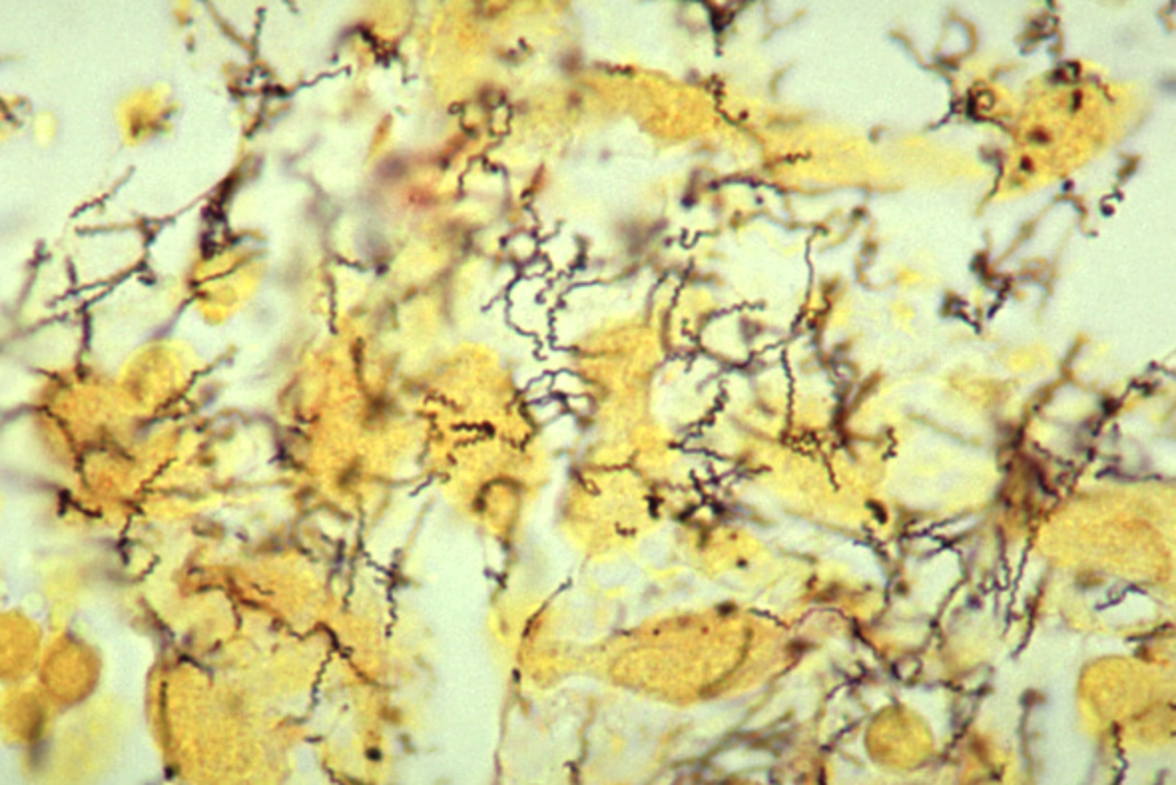Только вскоре после начала XX века немецкий зоолог Фриц Шаудинн и дерматолог Эрих Хоффман впервые обнаружили этиологический агент заболевания - Treponema pallidum - в тканях больных. После идентификации T. pallidum ученые знали, на что следует обратить внимание при разработке тестов для диагностики сифилиса. Ниже представлено фото спирохет T. pallidum в инфицированной ткани яичка, окрашенных серебром модифицированным методом Штайнера. Возможно, это не совсем то, что видели Шаудинн и Хоффман, но это хороший пример того, как ткань может быть инфицирована большим количеством спирохет при исследовании под микроскопом.