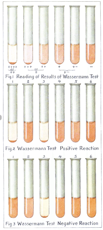 Примерно в то же время в Германии бактериолог Август Пауль фон Вассерман совместно с двумя дерматологами/венерологами Альбертом Нейссером (в честь которого была названа Neisseria gonorrhoeae) и Карлом Бруком разработали первый серологический тест для диагностики сифилиса. В их работе, опубликованной в 1906 году, использовался метод фиксации комплемента, разработанный бельгийскими учеными Жюлем Борде и Октавом Жангу. (Одно очко тому, кто сможет ответить, какой организм, названный в честь Борде, растет в культуральной среде, разработанной этими двумя микробиологами). Наличие в сыворотках пациентов антител, "специфичных" для сифилиса, которые в то время метко называли антителами Вассермана, приводило к образованию иммунных комплексов и истощению факторов комплемента, в результате чего индикаторные эритроциты оставались неповрежденными (положительная реакция Вассермана). На рисунке ниже показан тест Вассермана и то, как интерпретировать результаты на основе наблюдения за эритроцитами.