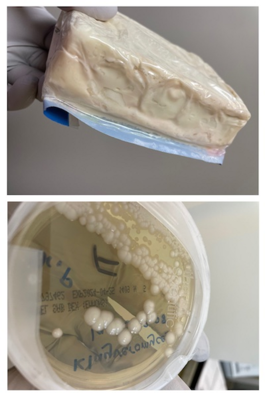Выделенный организм был идентифицирован как Kluyveromyces lactis. K. lactis - это дрожжи, используемые в производстве сыра в качестве замены животного сычужного фермента, который служит для свертывания молока. Возможно, рост в данной упаковке сыра фета был вызван каким-то нарушением процесса пастеризации или производства - K. lactis был обнаружен к примеру в испорченной фете, полученной в ходе исследования на Сардинии.