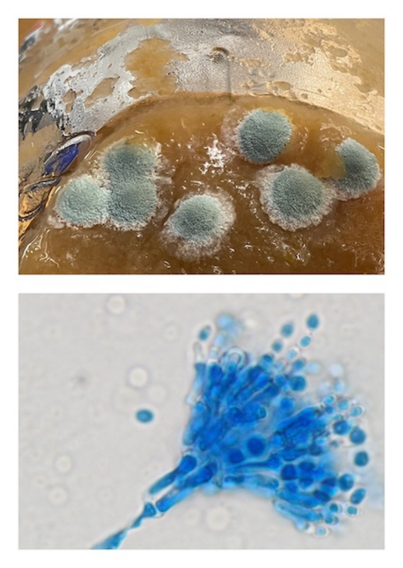 Я привел изображения 3 характерных структур типа плесени, но их, вероятно, было больше. Правый верхний вид плесени демонстрировал конидиофоры, фиалиды и конидии, что наводит на мысль об Aspergillus, распространенной плесени, которая может вызывать серьезные инфекции у людей, особенно с ослабленным иммунитетом. Однако этот вид не был похож на одну из распространенных клинических разновидностей, и я предположил, основываясь на сравнении с известным распределением фиалид и конидий, что это может быть A. glaucus.