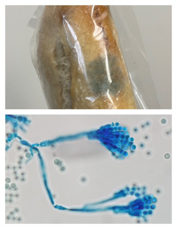 Вверху: заплесневелый хлеб из магазина. Внизу: лактофеноловая окраска микроорганизмов из образца хлеба.