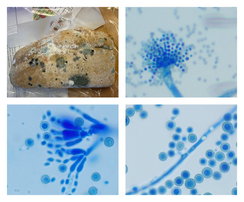 Слева вверху: заплесневелый домашний хлеб. Справа и снизу: лактофеноловое окрашивание микроорганизмов из образца хлеба.