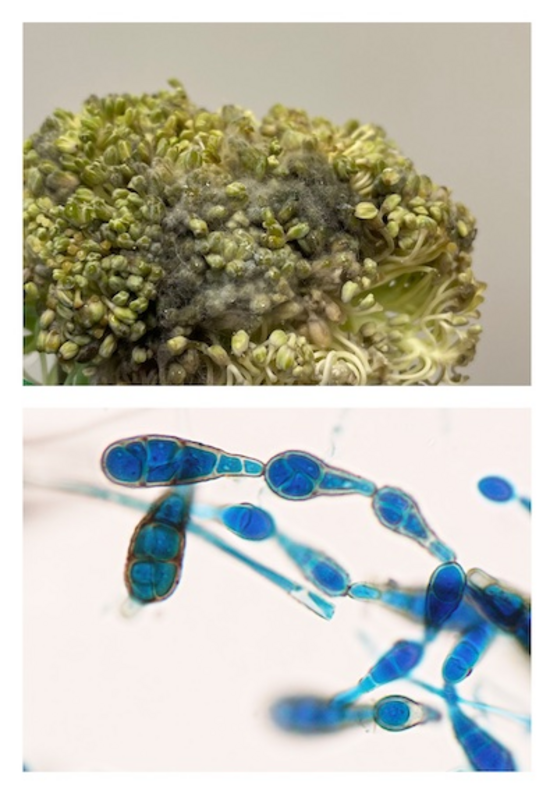 На отпечатке было обнаружено несколько красивых септальных гиф и крупных конидий с продольными и поперечными септами, характерными для плесени Alternaria. Темно-серый цвет пуха на брокколи наводил на мысль, что это демациановая плесень, которая вырабатывает пигмент меланин. Alternaria также распространена в окружающей среде, но может вызывать серьезные кожные и глазные инфекции у людей (в основном с ослабленным иммунитетом).