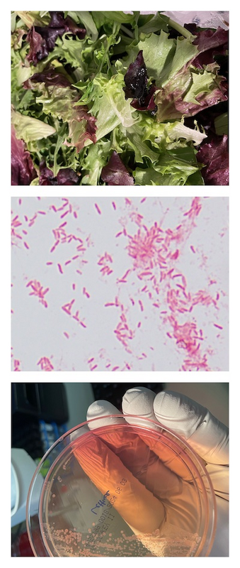 Вверху: разлагающаяся салатная смесь. В центре: окрашивание по Граму микроорганизмов из образца. Внизу: микроорганизмы на агаре Макконки.