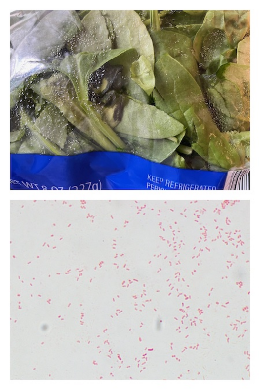 Вверху: разлагающийся шпинат. Внизу: окрашивание по Граму микроорганизмов из образца шпината.