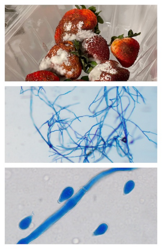 Вверху: заплесневелая клубника. Внизу: окрашивание лактофеноловым синим микроорганизмов из образца клубники.