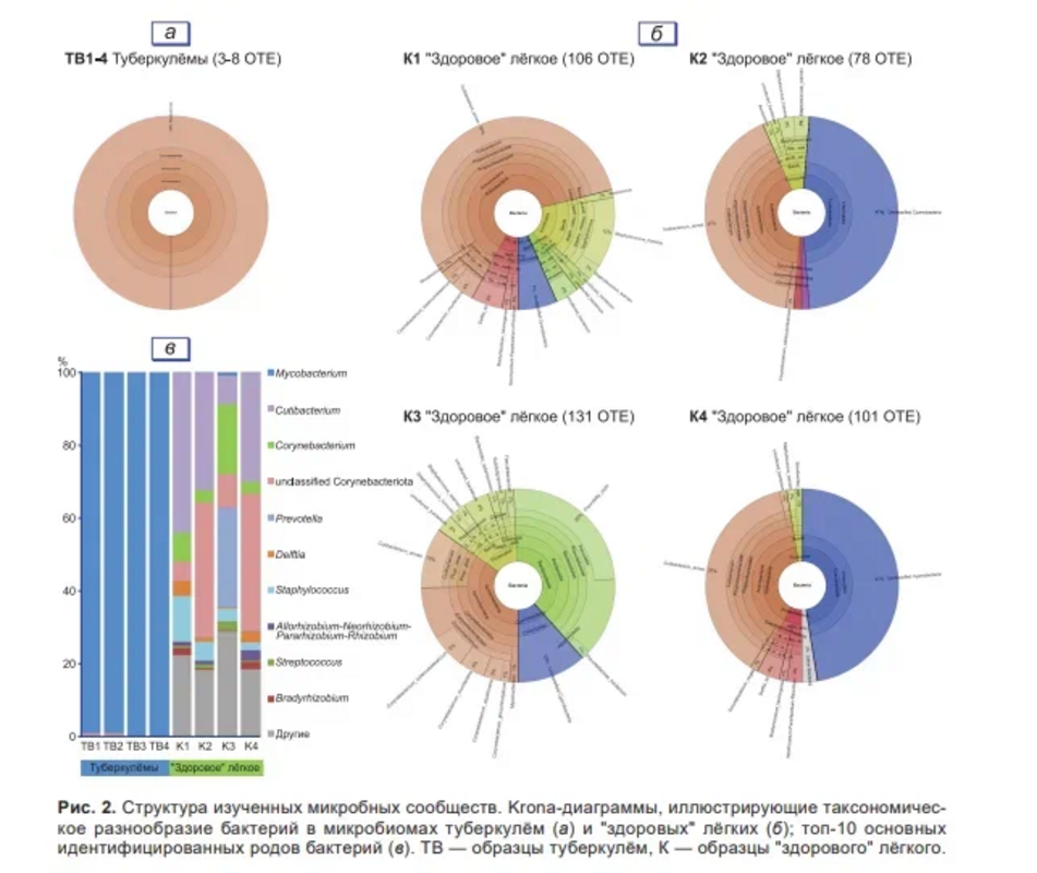 Микробиологи НЦ изучают структуру, особенности строения, потенциал функций микробиоты в очагах туберкулеза в легких. Материал для исследований – уникальные образцы туберкулемы, которые были иссечены хирургическим путем. Их сравнивали с образцами здоровой легочной ткани пациентов с онкологией легких. «Участки “здоровой” ткани и творожистый некроз из туберкулем –уникальные объекты для исследования микробиома легких при туберкулезе.