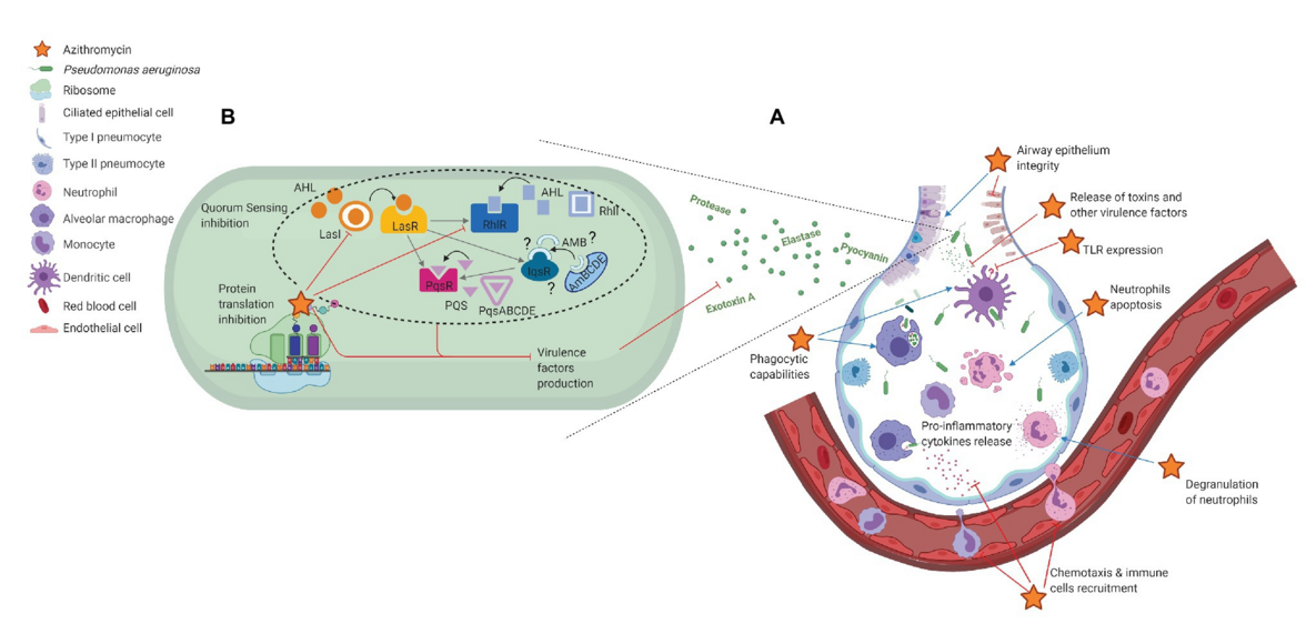 Рис.1. Неантибиотические эффекты азитромицина при острой пневмонии Pseudomonas aeruginosa. A) иммуномодулирующие эффекты; B) снижение вирулентности P. aeruginosa. Эффекты азитромицина проявляются в виде торможения (красный) или стимуляции (синий).