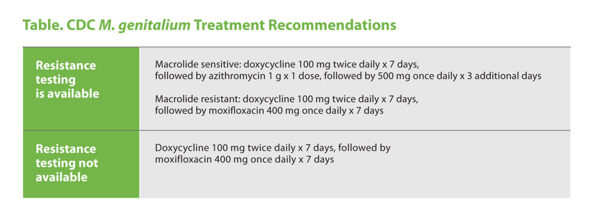 Именно поэтому в новом руководстве CDC по лечению ИППП рекомендуется двухэтапная терапия (таблица). Начало лечения доксициклином снижает нагрузку на организм, облегчает очищение и может помочь снизить риск развития резистентности. В недавнем исследовании, проведенном в шести клиниках по лечению ИППП и включавшем мужчин с симптомами уретрита, было установлено, что среди тех, кто лечился только азитромицином, о постоянных симптомах сообщили 25,8% пациентов с резистентной к макролидам инфекцией M. genitalium, в то время как 13% пациентов без резистентности к макролидам сообщили о постоянных симптомах.