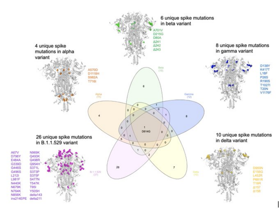Омикрон имеет наибольшее количество новых мутаций спайка, включая их поразительное скопление в "короне", что указывает на значительное давление отбора и антигенное отличие от предыдущих штаммов.