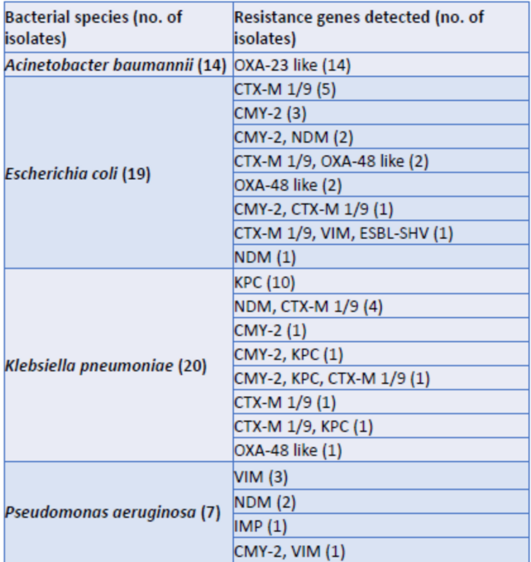 Всего в исследование было включено 58 положительных КК (56 мономикробных и 2 полимикробных). Анализ GNR правильно идентифицировал 74 (100%) из 74 β-лактамаз из 60 микроорганизмов, включая CMY (n=10), CTX M (n=16), KPC (n=13), NDM (n=9), OXA 23 (n=14), OXA 48 (n=5), ESBL SHV, (n=1), IMP (n=1) и VIM (n=5).