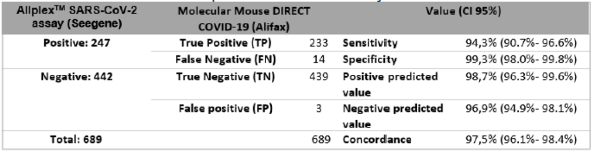 Целью исследования была оценка ММ DIRECT COVID-19 в сравнении с клинико-диагностическими характеристиками AllplexTM SARS-CoV-2 (Seegene), референсным методом RT-PCR, который регулярно используется в нашей лаборатории.