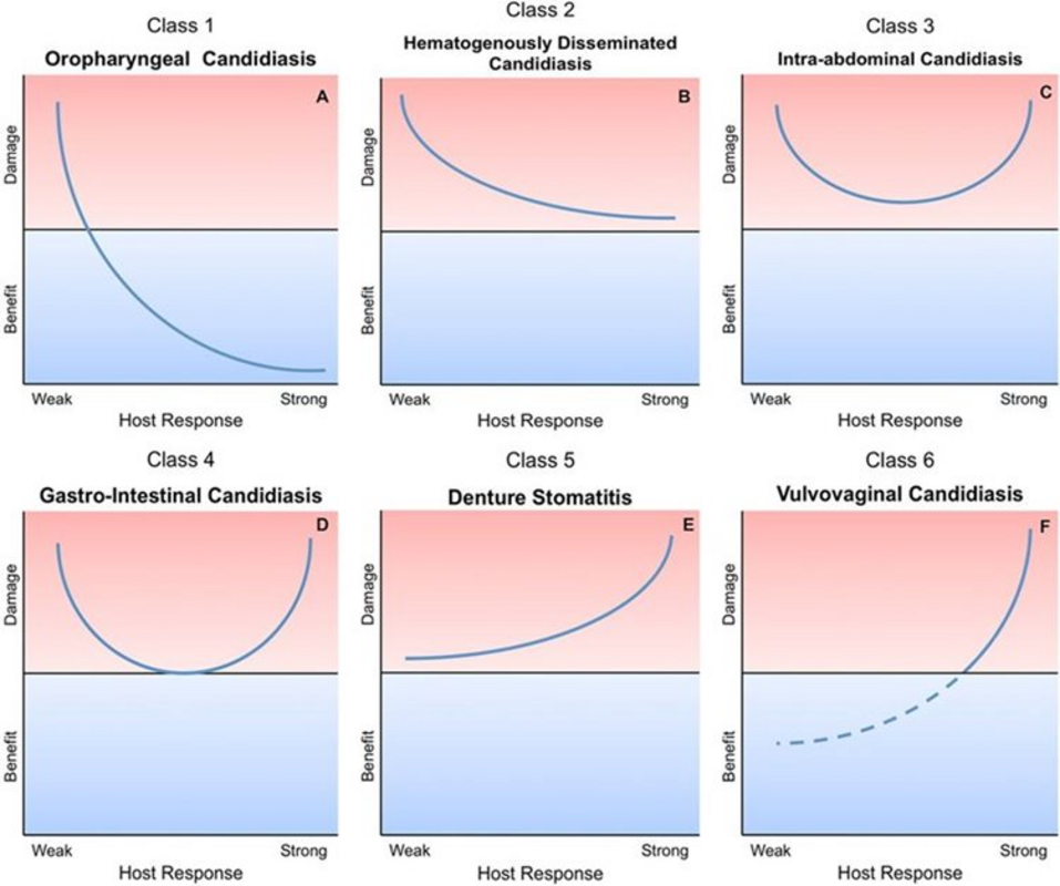 Вариации базовой параболы «повреждение-реакция» для описания различных инфекций Candida albicans.