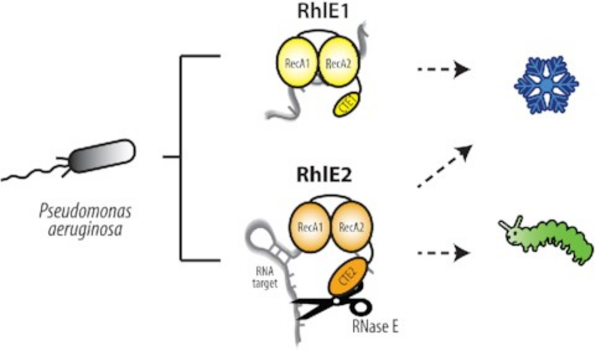 Мы показали, что в ходе эволюции RhlE1 и RhlE2 разошлись в своих биологических функциях, молекулярных партнерах и РНК-зависимых ферментативных активностях. В то время как RhlE1 в основном необходим для роста в холоде, RhlE2 действует как глобальный посттранскрипционный регулятор, влияя на уровень сотен клеточных транскриптов, необходимых как для адаптации к окружающей среде, так и для вирулентности.