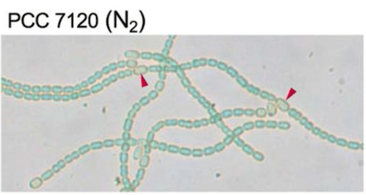 Многоклеточная цианобактерия Anabaena демонстрирует разделение труда на фотосинтезирующие клетки (зеленые) и азотфиксирующие гетероцисты (наконечники стрелок).