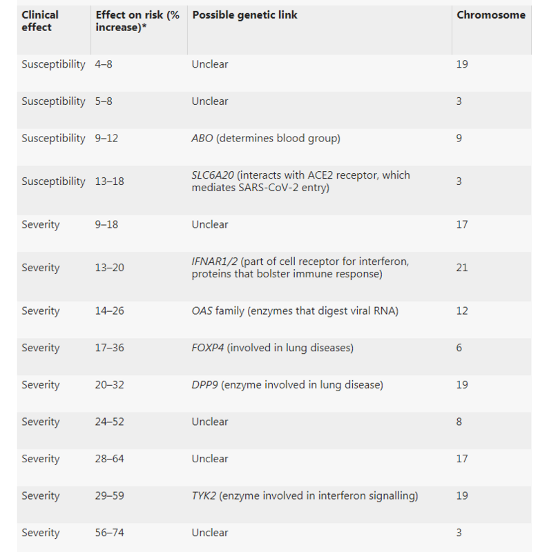 Обнаруженные ими генетические ассоциации повышают риск на относительно небольшую величину, хотя некоторые из показателей повышения сравнимы с таковыми для таких факторов риска, как ожирение, диабет и другие сопутствующие заболевания (см. "Генетические варианты, изменяющие риск COVID-19").