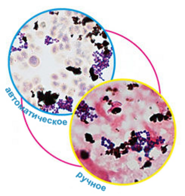 - Интенсивность окраски и обесцвечивания регулируется в зависимости от плотности мазка