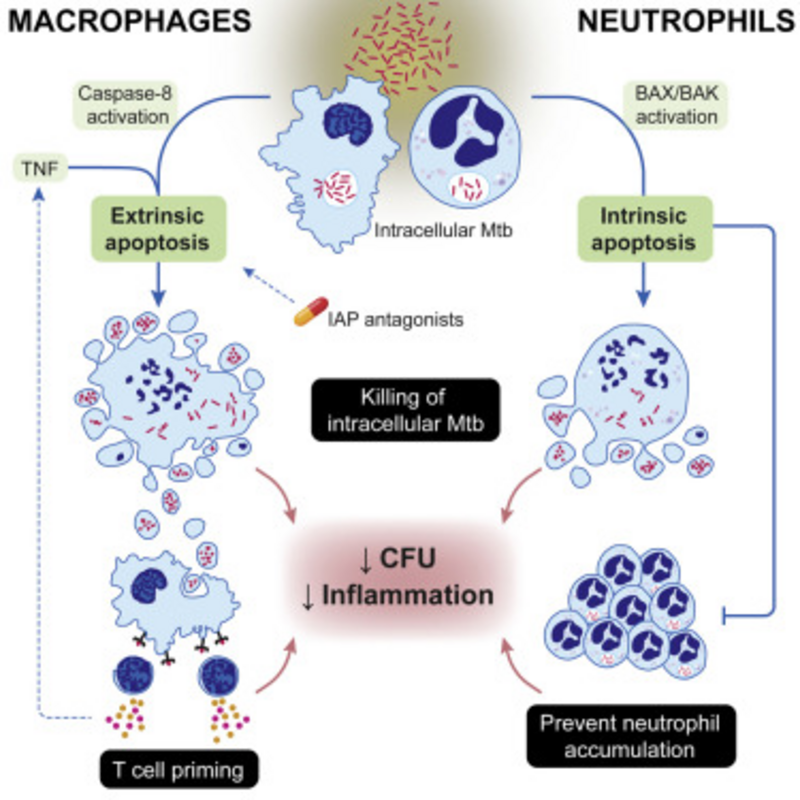 Кроме того, мы показали, что апоптотические пути могут быть направлены на терапию с помощью находящихся на клинической стадии соединений, антагонизирующих белки ингибитора апоптоза (IAP), что способствует очищению организма от M. tuberculosis в мышиной модели. Эти результаты показывают, что любое ингибирование апоптоза M. tuberculosis является неполным in vivo, продвигая наше понимание защитных реакций хозяина при туберкулезе и выявляя механизмы хозяина, которые могут стать мишенью для лечения заболевания.